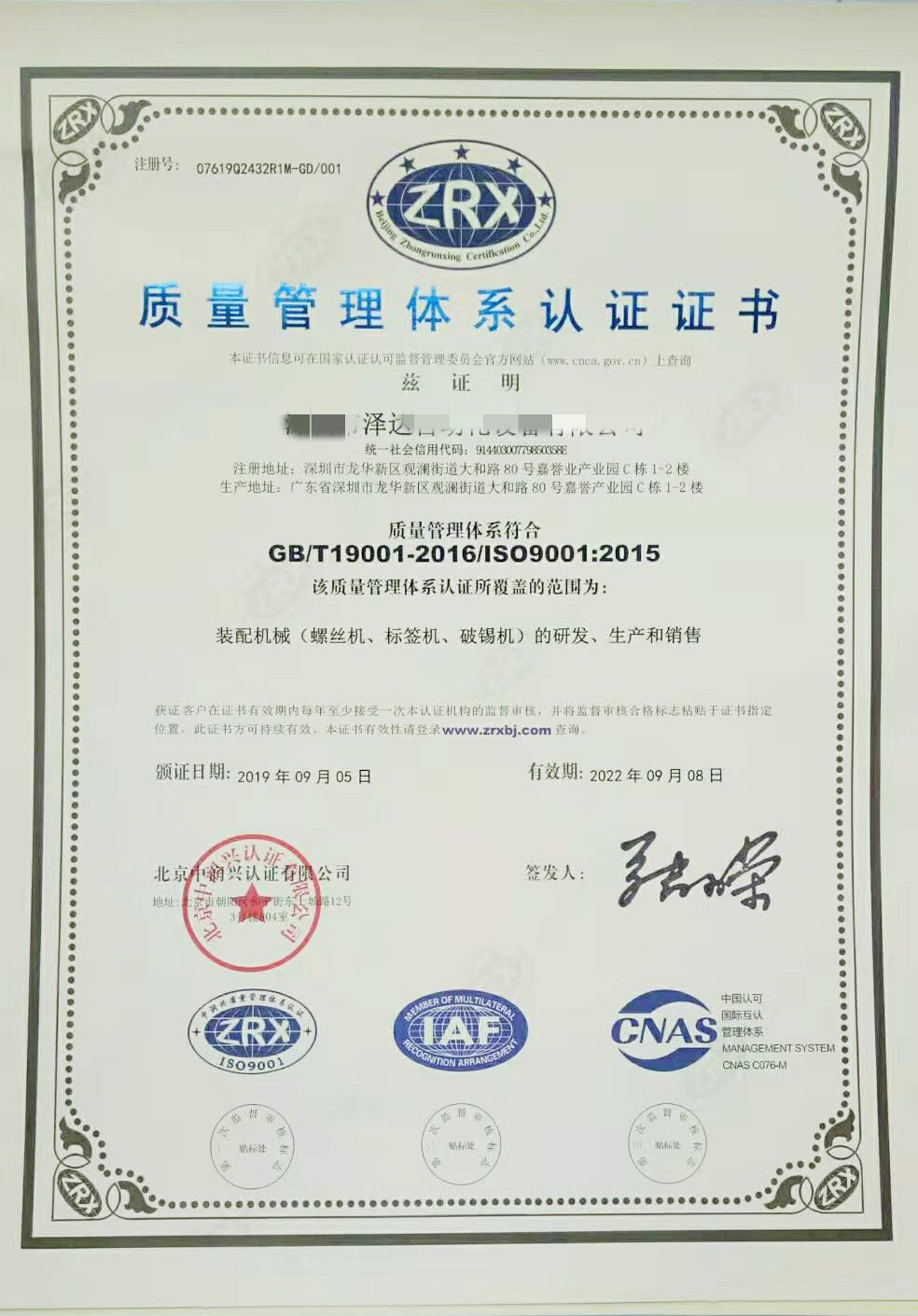 螺絲機專業(yè)生產(chǎn)廠家已通過ISO9001質(zhì)量管理體系認證